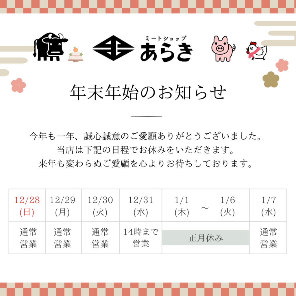 年末年始のお知らせ 2025年12月15日 最終更新日時 : 2025年12月15日 ソウ いつも肉のあらきをご愛顧いただき、誠にありがとうございます。年末年始の営業について、下記の通りお知らせいたします。 🥩 お正月用のお肉のご予約も承り中!年末は混み合いますので、事前のご予約がおすすめです✨ ご予約は12/20(土)まで!店頭・電話・公式LINEにて受付しております。 大晦日まで元気に営業しております!皆様のご来店を心よりお待ちしております🍖
